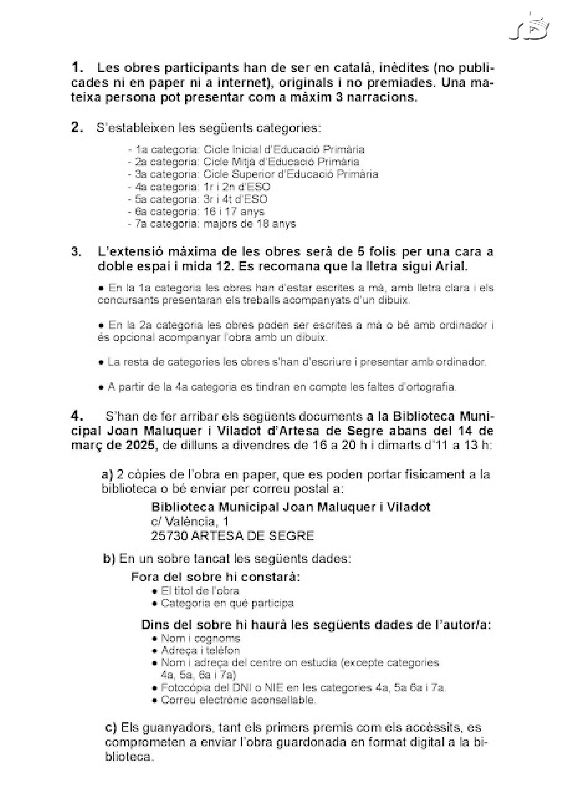 La Biblioteca Joan Maluquer i Viladot i l'Ajuntament d'Artesa de Segre convoquen el 35è Premi de Narrativa Breu