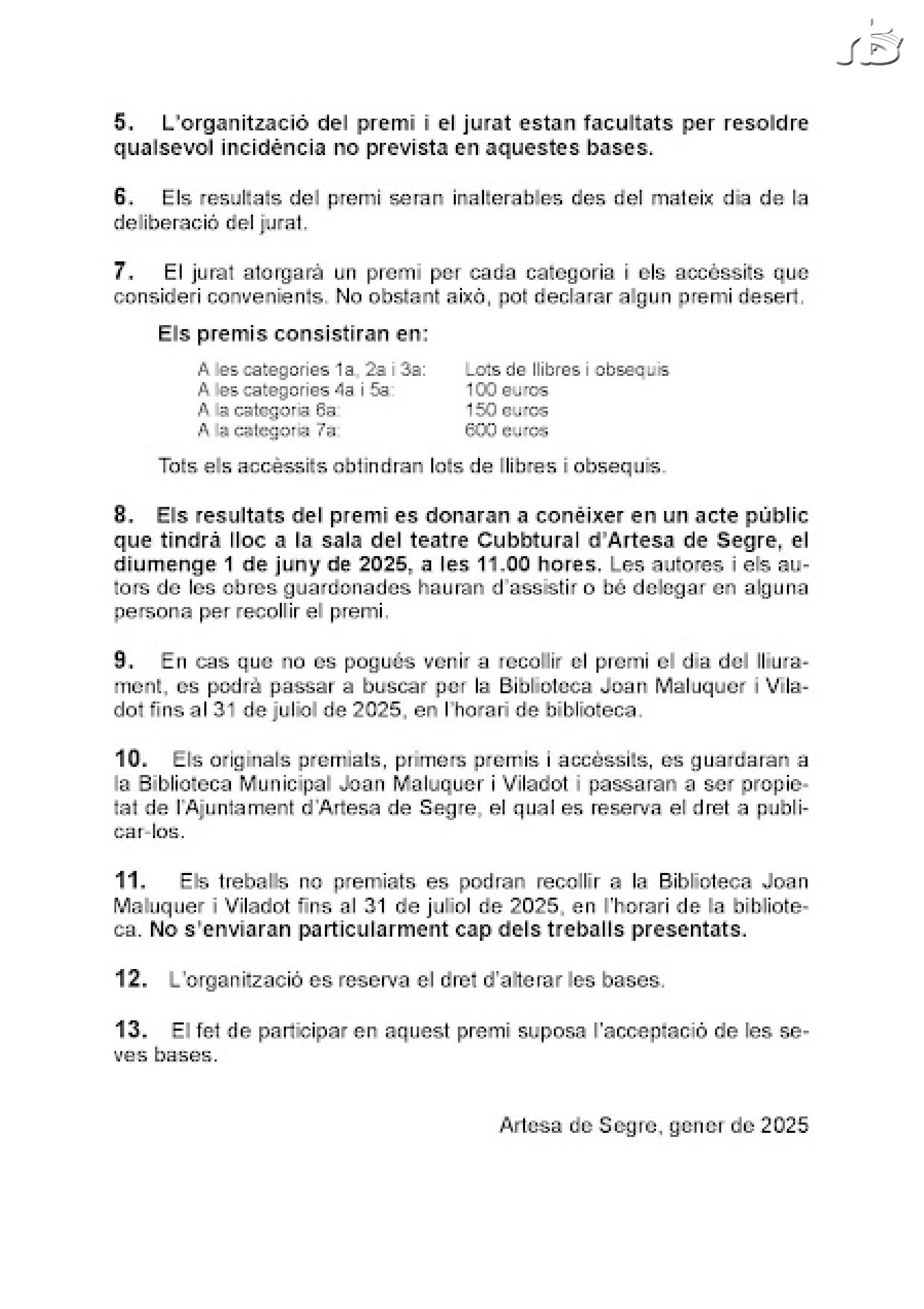 El termini per presentar les obres és el 14 de març de 2025. Els resultats del premi es donaran a conèixer en un acte públic durant el mes de juny.