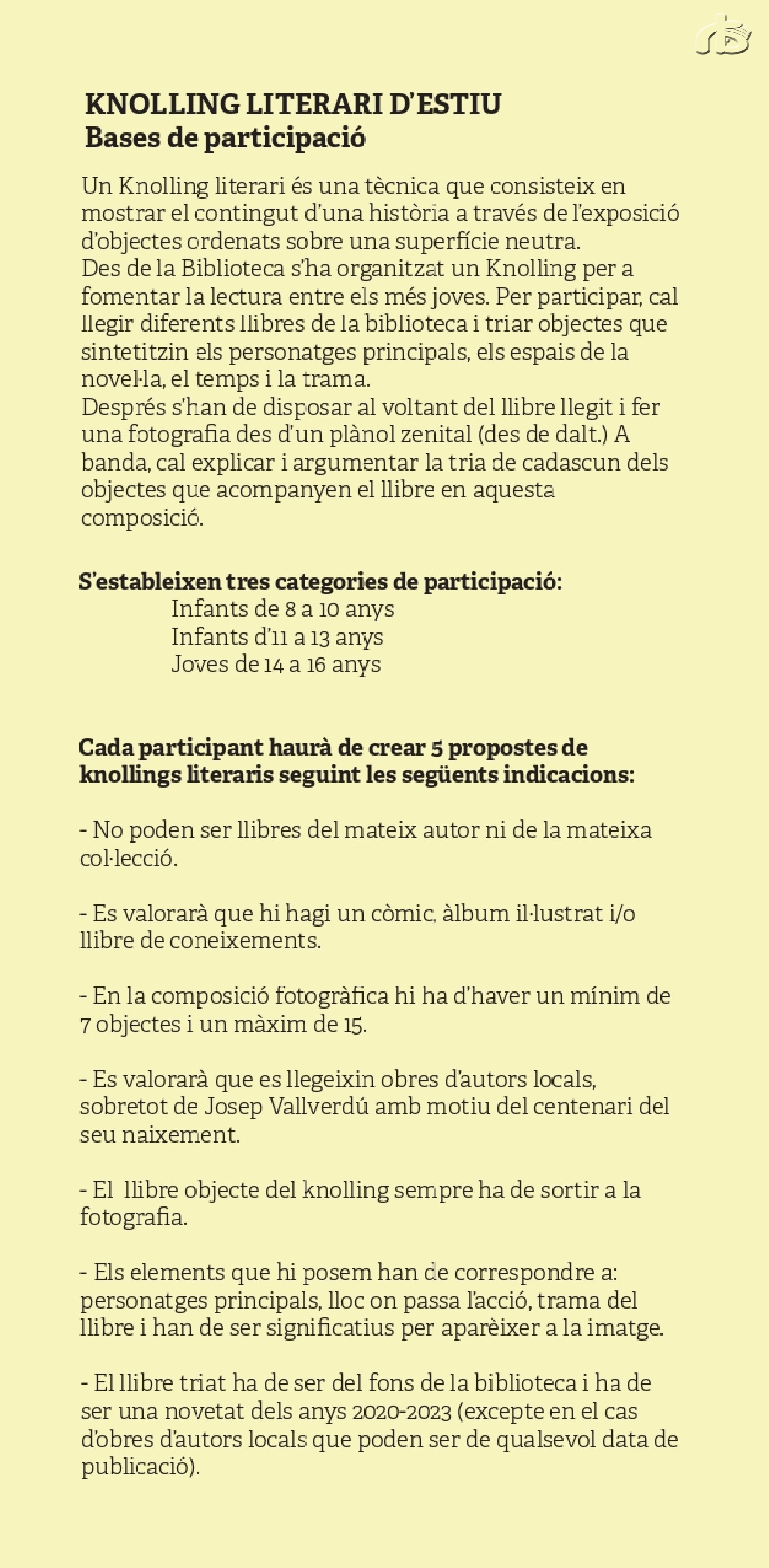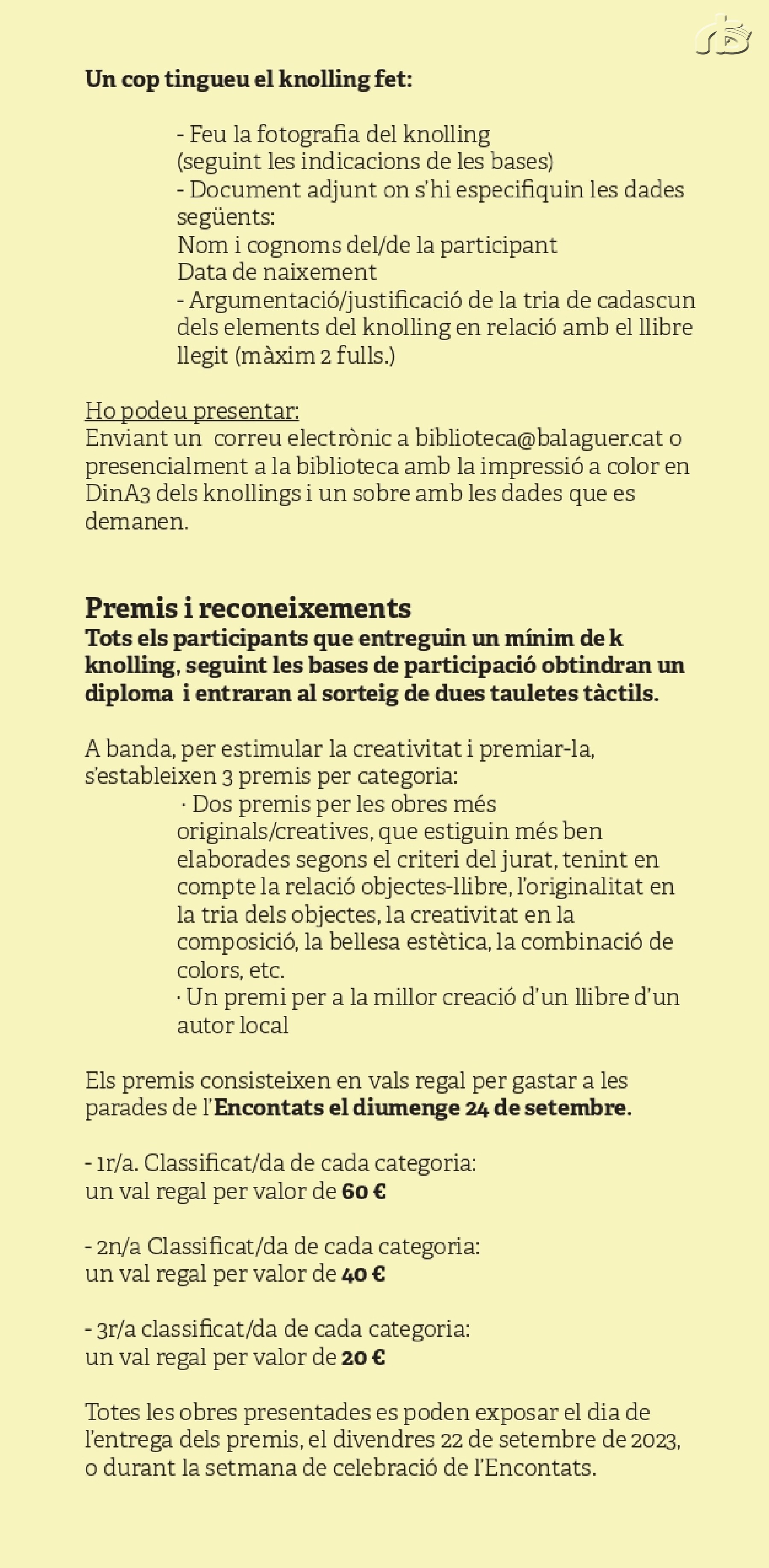- Un document adjunt on s'hi especifiquin les dades següents: nom i cognoms del/ de la participant, data de naixement i argumentació/justificació de la tria de cadascun dels elements del knolling en relació amb el llibre llegit (màxim 2 fulls)