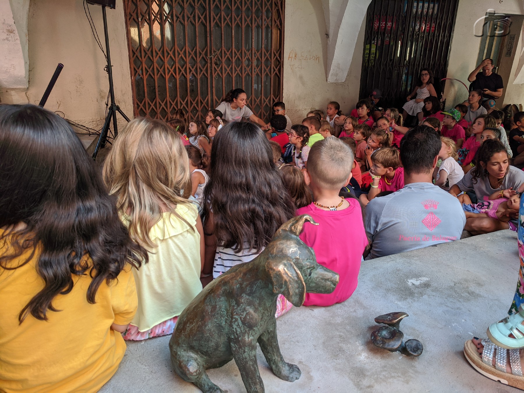 Precisament l'activitat s'ha dut a terme a la plaça del Pou, on està ubicat el famós gos Rovelló, i protagonista del llibre de l'escriptor Josep Vallverdú, que també ha assistit. La sessió de contacontes estava adreçada als usuaris de les estades d'estiu.