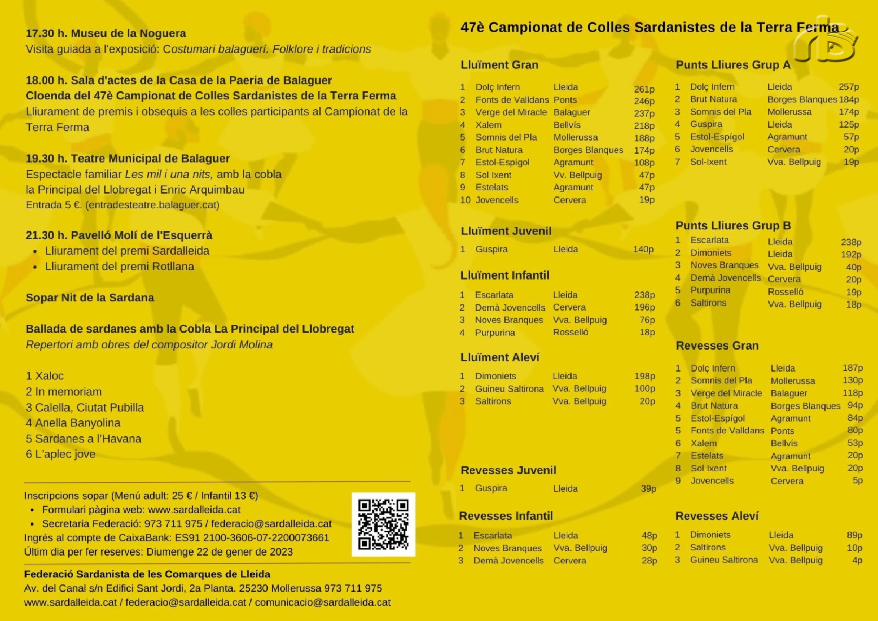 Els actes previstos començaran a les 17.30 h al Museu de la Noguera, on s'oferirà una visita comentada a l'exposició 'Costumari balaguerí. Folklore i tradicions', en la qual es proposa un recorregut històric per les expressions materials de la memòria de les festes, les costums i la cultura popular de la ciutat. Seguidament, a les 18 h a la sala d'actes de la Casa de la Paeria, es farà entrega de diversos premis i obsequis a les colles amb motiu de la cloenda del 47è Campionat de colles sardanistes de la Terra Ferma. A l'acte hi assistiran l'Ilꞏlm. Sr. Jordi Ignasi Vidal, paer en cap de Balaguer: la Ilꞏlma. Sra. Estefania Rufach, vicepresidenta de la Diputació de Lleida; el Sr. Albert Turull, director dels Serveis Territorials de Cultura de la Generalitat a Lleida; la Sra. Núria Escudé, presidenta de la Unió de Colles Sardanistes de Catalunya; el Sr. Carles Vall, president de la Federació Sardanista de les Comarques de Lleida; i el Sr. Albert Masagué, President de l'Agrupació de Colles Sardanistes de les Terres Lleidatanes.