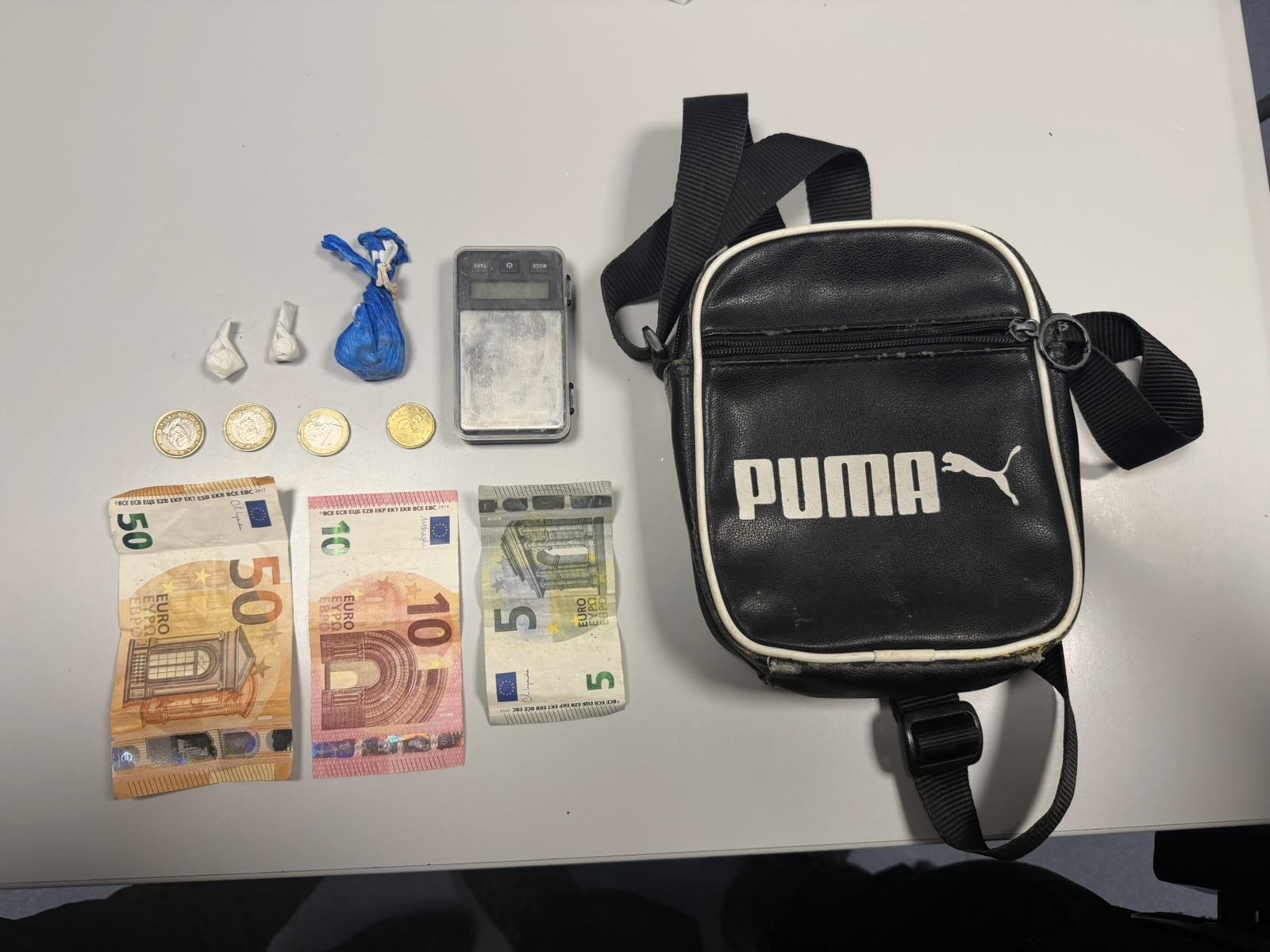 Durant la persecució, l’individu va llençar sota un vehicle estacionat una bossa de mà que contenia petites quantitats de substància estupefaent, presumptament cocaïna, ja dosificada per a la seva distribució, així com una bàscula de precisió i diners en efectiu.