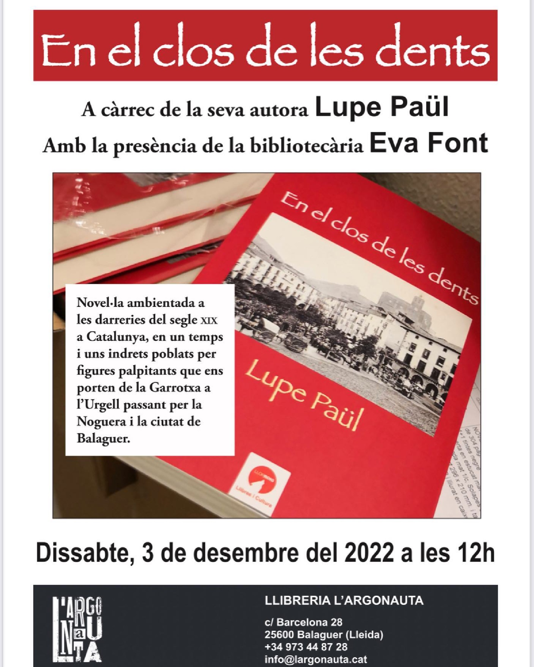 I el dissabte 3 de Novembre a les 12.00, es presenta el llibre "En el clos de les dents", una novel·la de Guadalupe Paül. La presentació anirà a càrrec de la bibliotecària Eva Font.