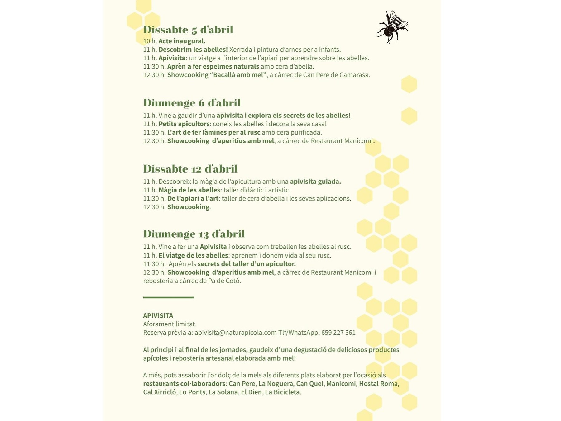 El programa —tal com ha explicat Miquel Cantons— inclou visites als abellars, les anomenades apivisites, a més de tallers familiars, exposició i venda de productes apícoles, demostracions d'extracció de mel, xerrades divulgatives i tastos de mel artesana. També s'hi afegeix una activitat molt esperada: els showcookings amb mel, on cuiners locals i apicultors mostraran la versatilitat d'aquest ingredient a la cuina.