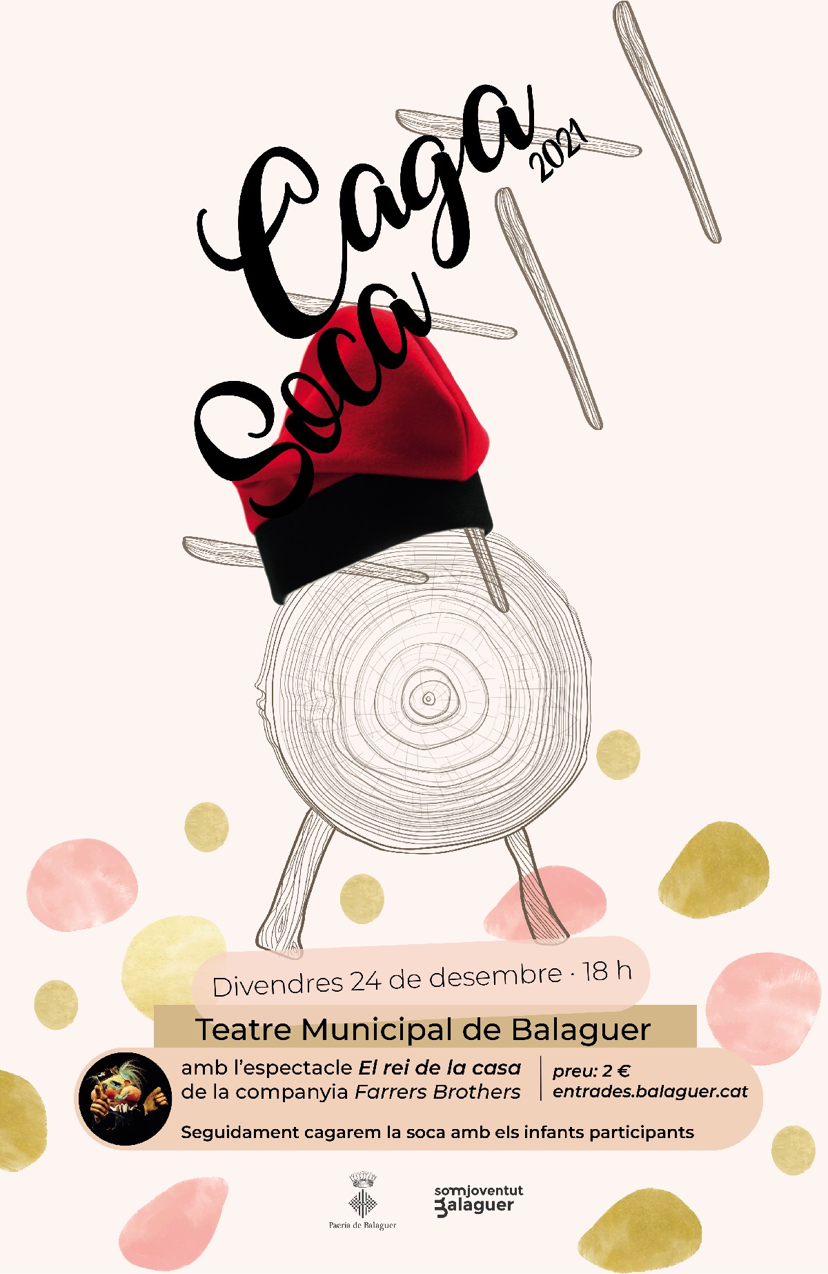 El 24 de desembre, a les 18 h i al Teatre Municipal tindrà lloc el Caga Soca de Nadal on tot els nens i nenes podran fer cagar el Tió de Balaguer, que va aparèixer l'any passat per primera vegada. Prèviament, tindrà lloc la representació de l'obra El Rei de la Casa