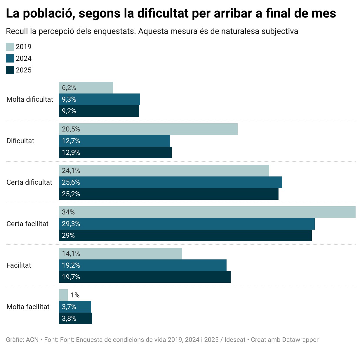 El nombre de persones que declaren arribar amb dificultat a final de mes representa el 47,3%, 3 dècimes menys que el 2024. Aquest col·lectiu inclou el 9,2% de ciutadans que diuen tenir molta dificultat per passar el mes des del punt de vista de les finances de la llar.