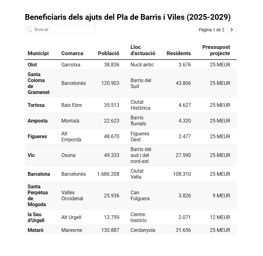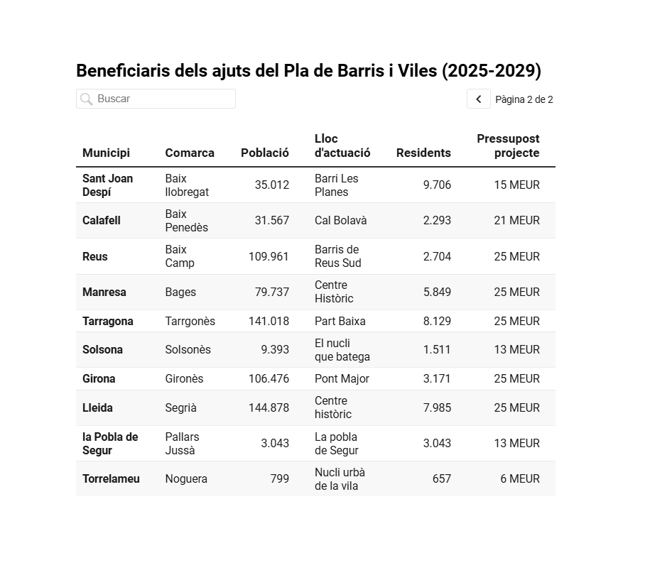 El Govern ha publicat aquest divendres la resolució de la primera convocatòria del Pla de Barris. La publicació detalla un total de vint municipis, entre els quals hi ha les quatre capitals catalanes. Els projectes que rebran més dotació econòmica s’ubiquen a Olot, Amposta, Vic, Tortosa, Figueres i Santa Coloma de Gramenet. El llistat de beneficiaris el completen Santa Perpètua de Mogoda, la Seu d’Urgell, Mataró, Sant Joan Despí, Calafell, Reus, Manresa, Tarragona, Solsona, la Pobla de Segur i Torrelameu. Les iniciatives escollides sumen un pressupost total de 412 milions d’euros, dels quals 232,71 els aportarà el Govern, una xifra superior a la prevista inicialment. Els 20 barris seleccionats s’han triat d’entre les 83 sol·licituds que va rebre el Govern. La comissió del Pla de Barris i Viles ressalta que hi ha projectes de totes les vegueries, de manera que considera que el repartiment és “equilibrat”.
