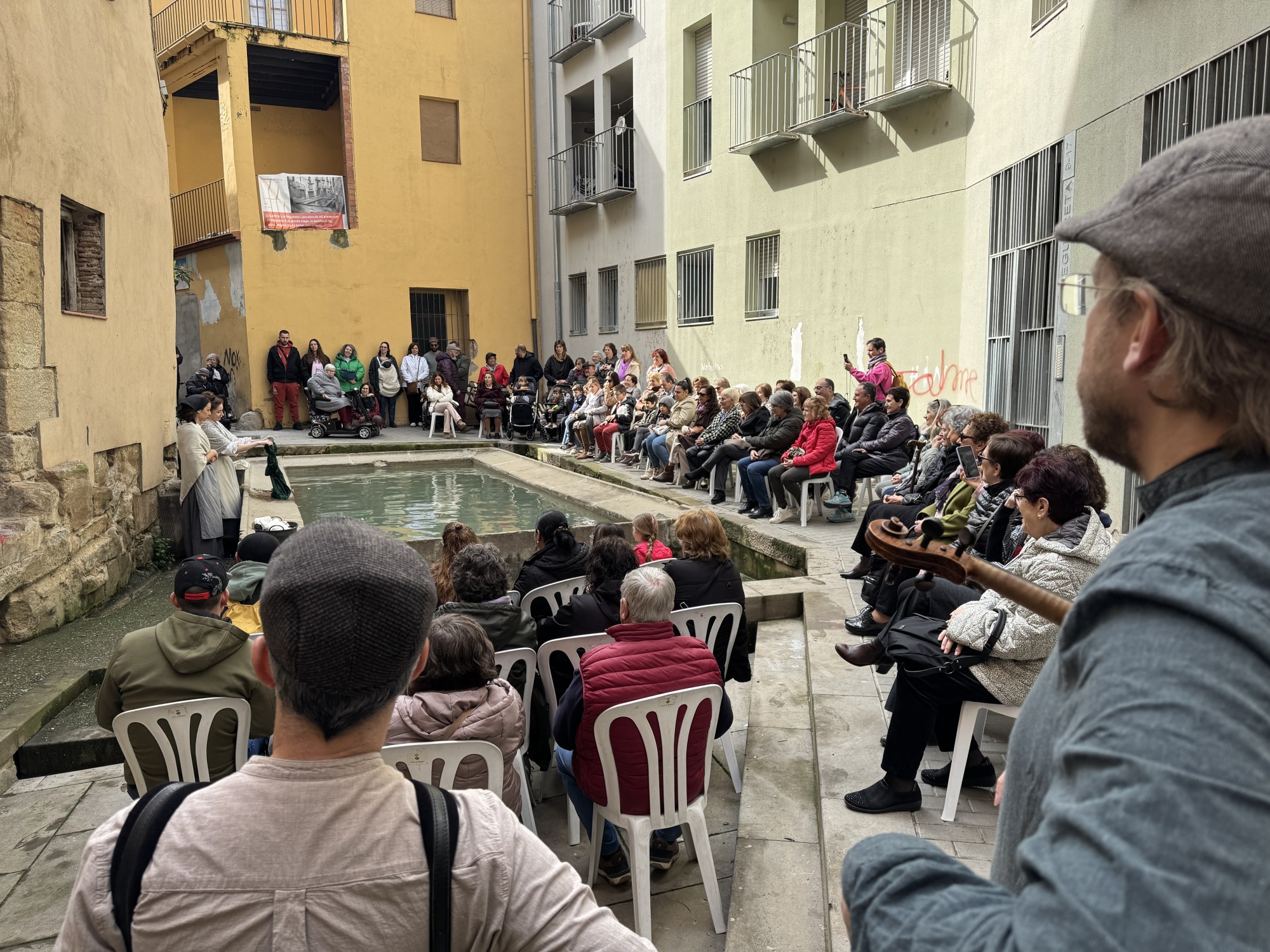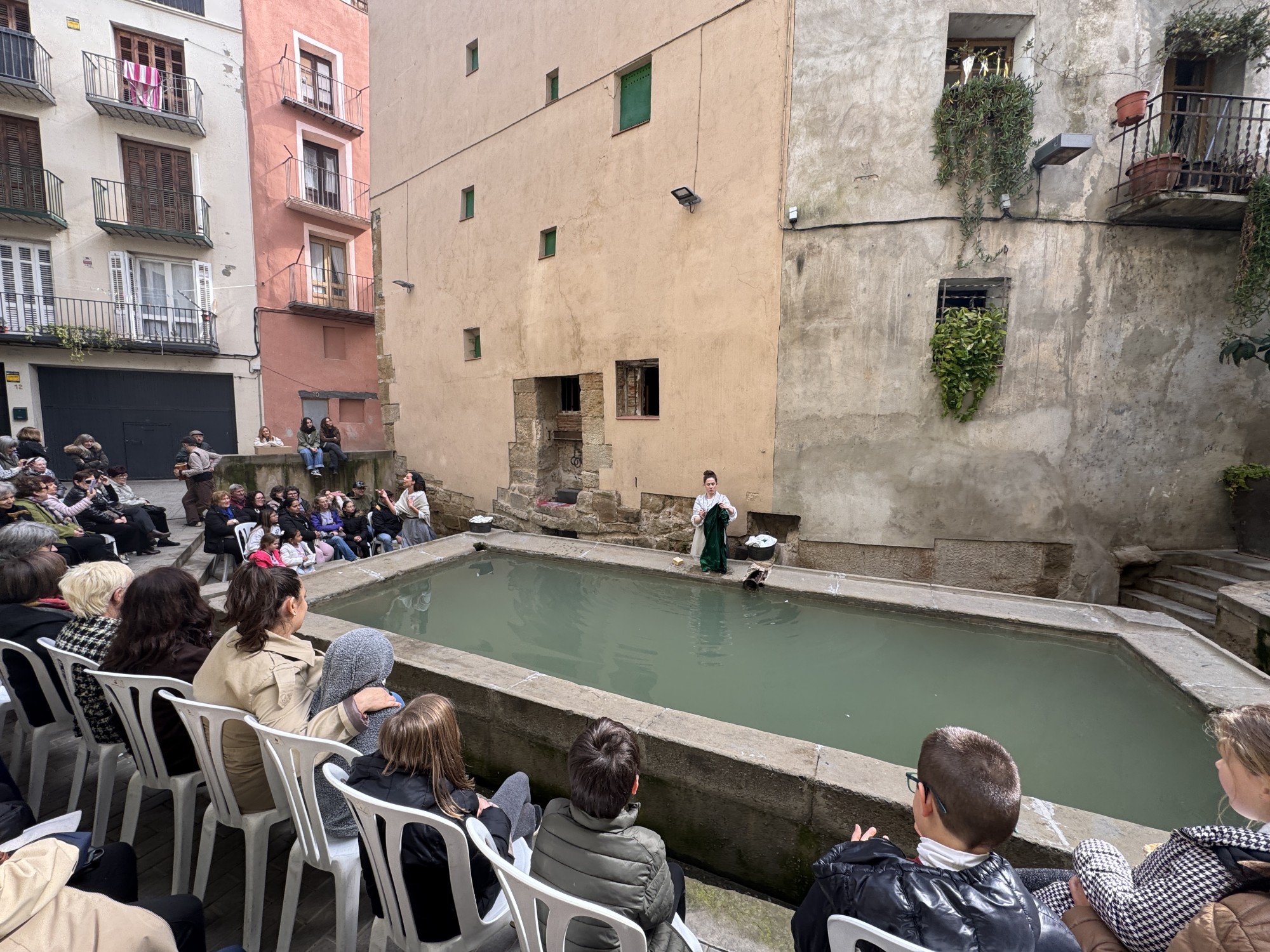 Un cop al safareig, l’espectacle ha volgut recuperar la memòria dels antics rentadors públics i donar veu a les dones que hi compartien estones de feina i vida quotidiana. Ho ha fet a través de personatges com la Isabel i la Caterina, dues dones amb somnis i camins vitals diferents. La representació ha combinat música, cançons i escenes amb to d’humor per retre homenatge a les àvies i a totes aquelles dones que van obrir camí a les generacions posteriors.