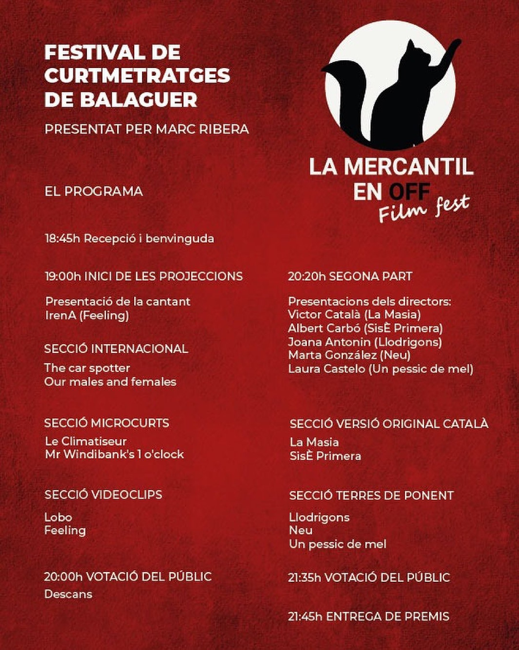 La productora Films en off i la sala Mercantil d'arts escèniques presenten la segona edició del Festival de Curtmetratges Internacional de Balaguer que tindrà lloc el dia 7 d'octubre a les 19.00h a La Mercantil.