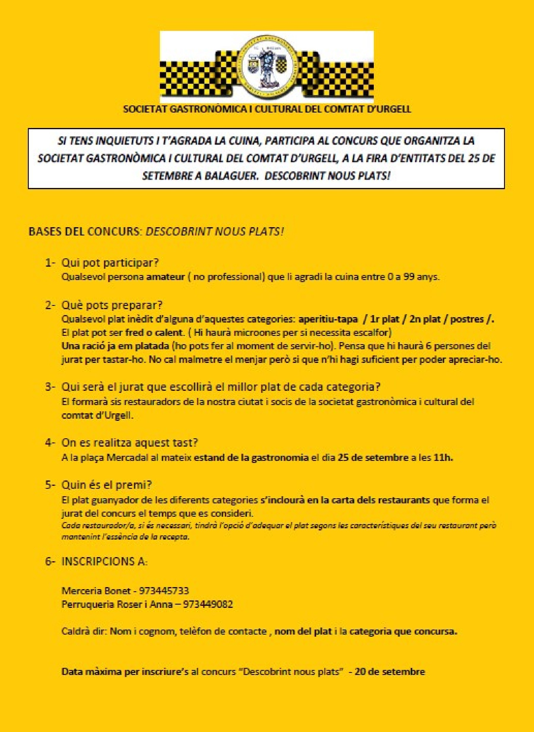 Caldrà dir: Nom i cognom, telèfon de contacte , nom del plat i la categoria que concursa.