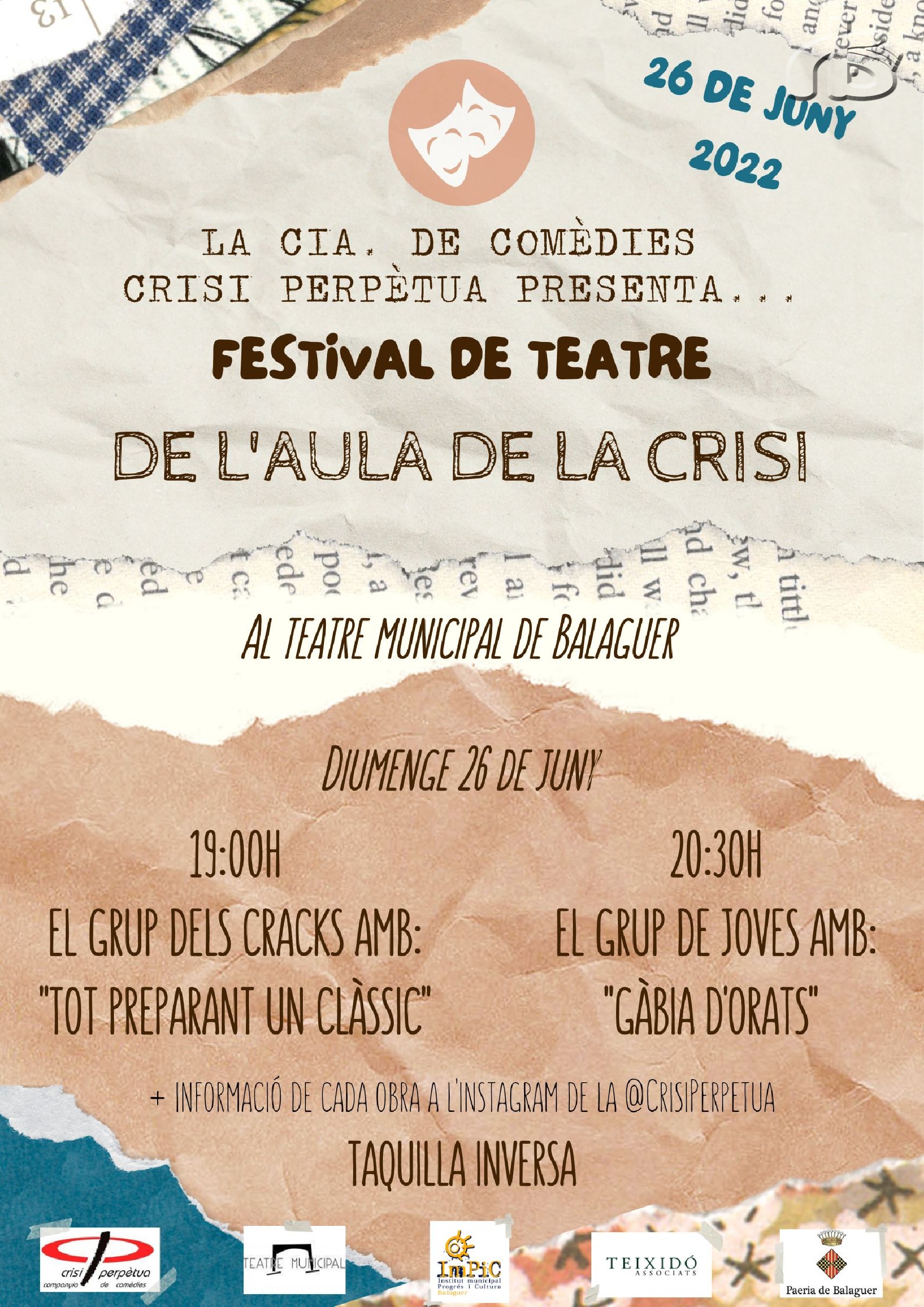 L'Aula de la Crisi Perpètua realitzarà el proper diumenge 26 de juny dues funcions al Teatre Municipal de Balaguer: Tot preparant un clàssic i Gàbia d'Orats, dirigides MIREIA FREIXAS, directora de l'aula de la Crisi