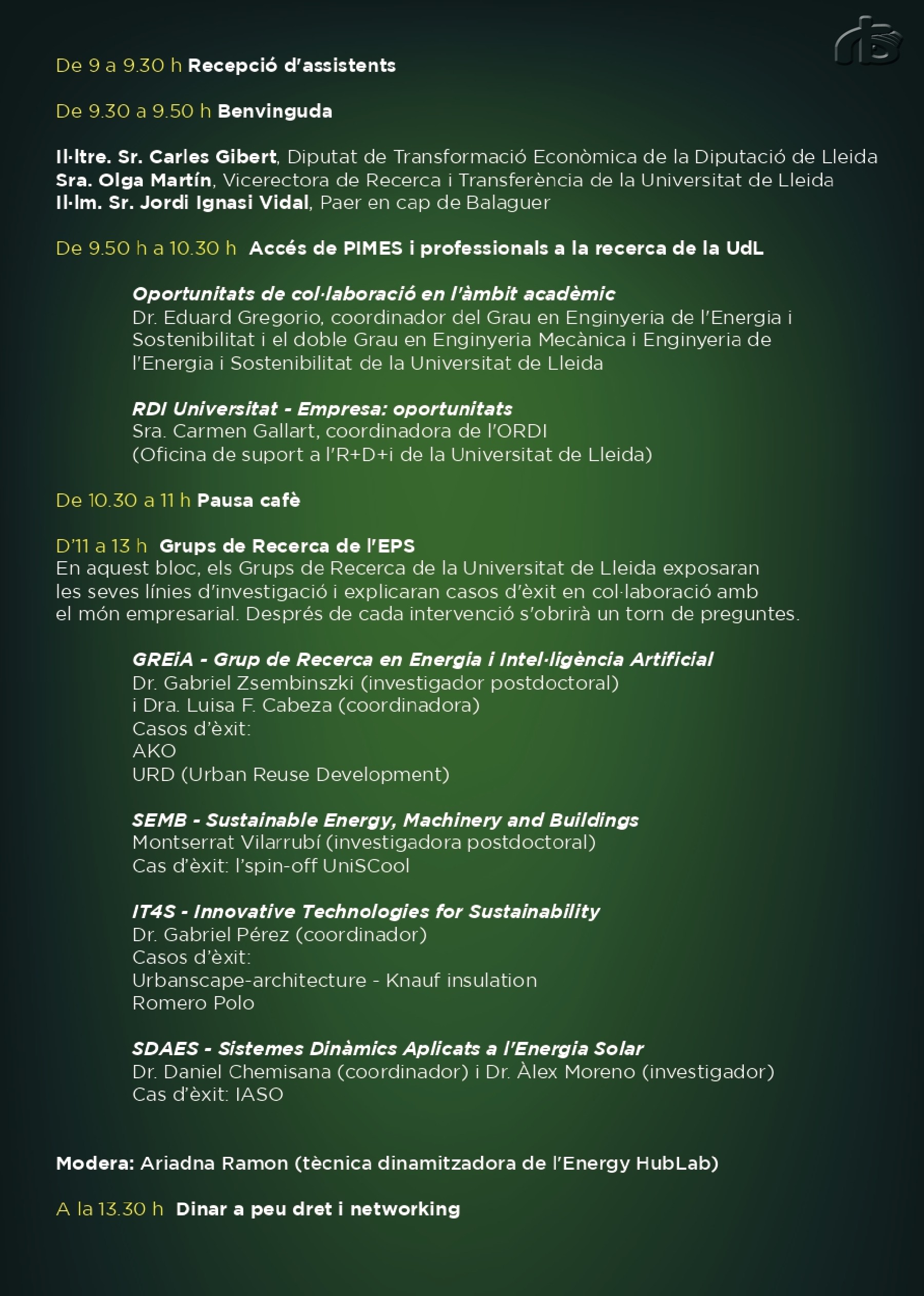 Seguidament s'iniciaran les intervencions dels ponents, la primera de les quals tractarà l'accés de les PIMES i professionals a la recerca de la Universitat de Lleida, i les oportunitats de col·laboració en l'àmbit acadèmic. Aquesta anirà de la mà del Dr. Eduard Gregorio, coordinador del Grau en Enginyeria de l'Energia i Sostenibilitat i el doble Grau en Enginyeria Mecànica i Enginyeria de l'Energia i Sostenibilitat de la Universitat de Lleida i de la Sra. Carmen Gallart, coordinadora de l'Oficina de suport a l'R D i de la Universitat de Lleida.
