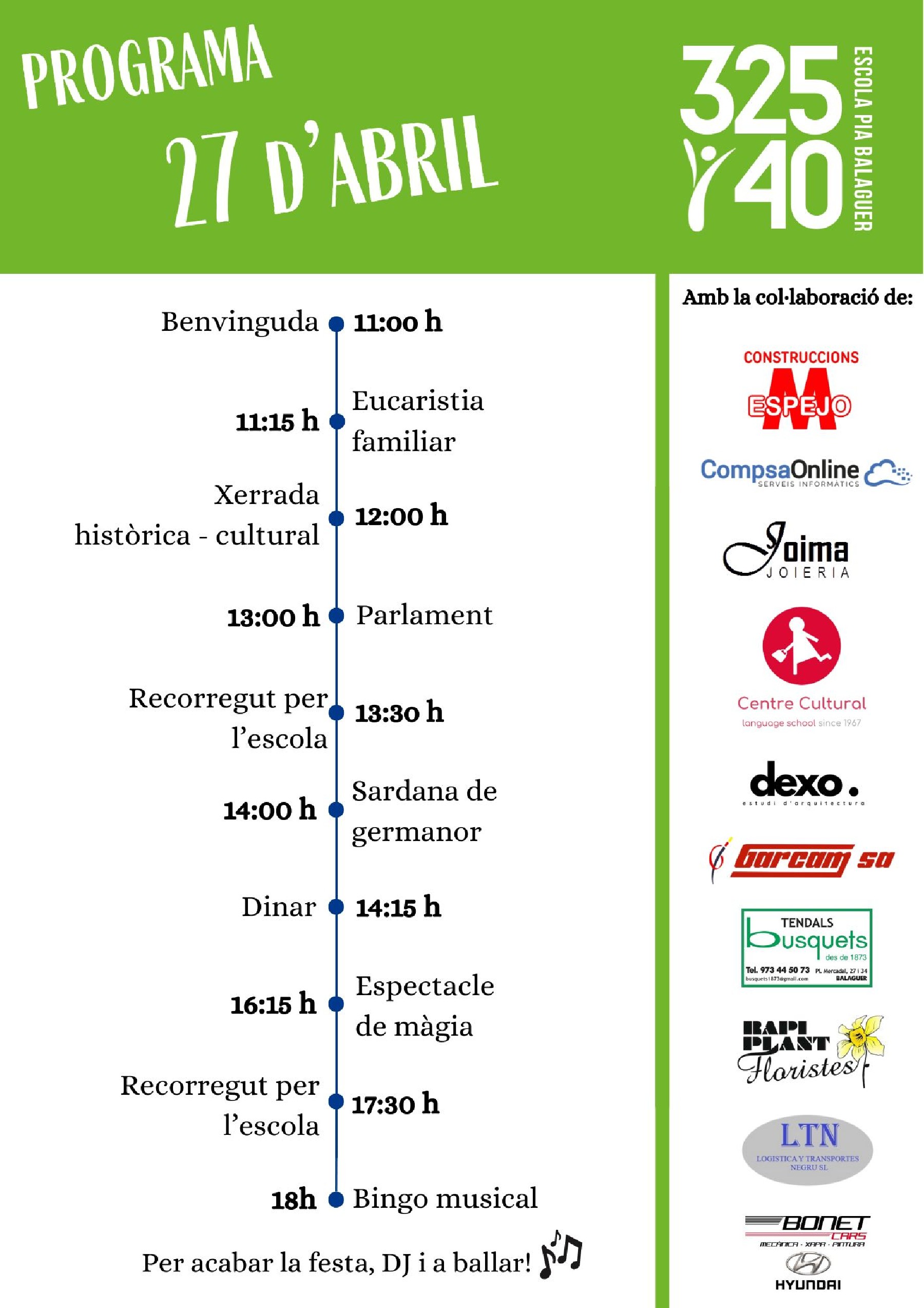 L'Escola Pia de Balaguer celebra aquest dissabte 27 d'abril la festa dels seus 325 anys a la ciutat i els 40 anys de la inauguració de l'edifici nou