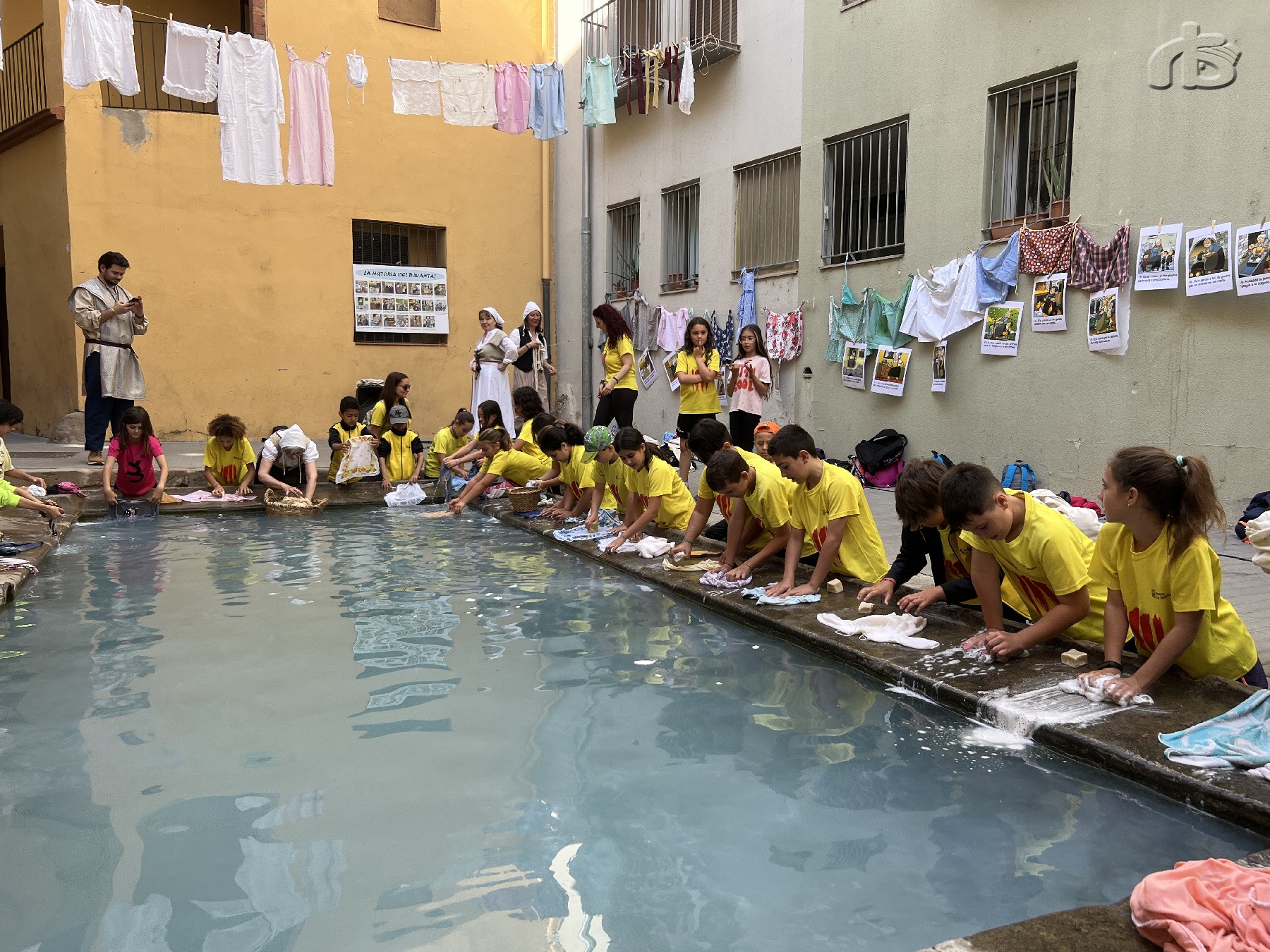 La jornada ha començat amb les visites per part dels alumnes de la ciutat al safareig de la Reguereta on membres de l'Associació Dona Rural els han explicat com es feia la bugada antigament i l'auca del davantal.