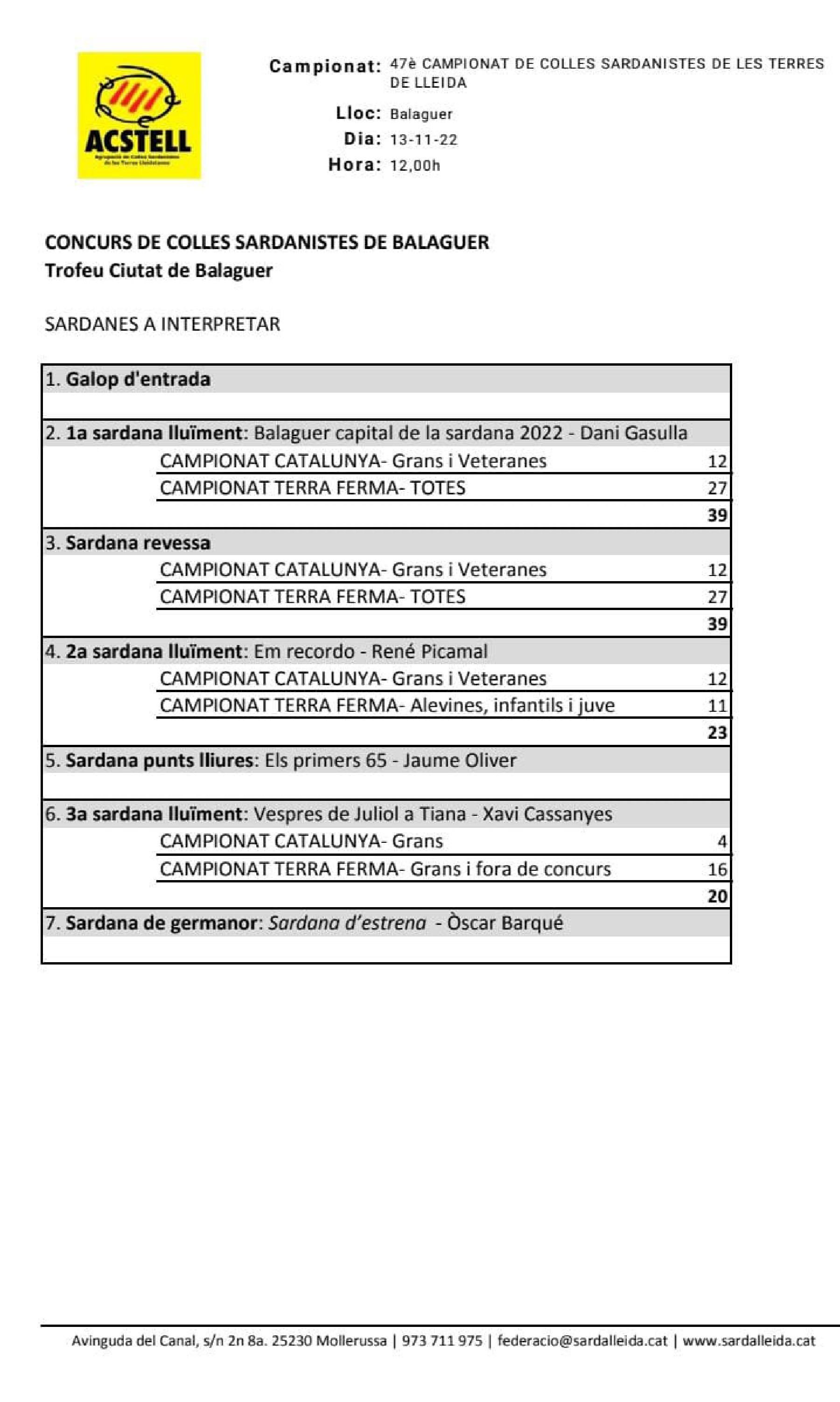 La primera sardana de lluïment serà "Balaguer Capital de la Sardana 2022" del compositor Dani Gasulla i serà defensada per totes les colles participants. Seguirà la sardana revessa també obligatòria per a totes les colles en totes les categories. La tercera serà la sardana en modalitat de lluïment, "Em recordo" de René Picamal i la ballaran les colles Grans i Veterans del Campionat de Catalunya i les colles de les categories Alevines, Infantils i Juvenils del Campionat de la Terra Ferma.