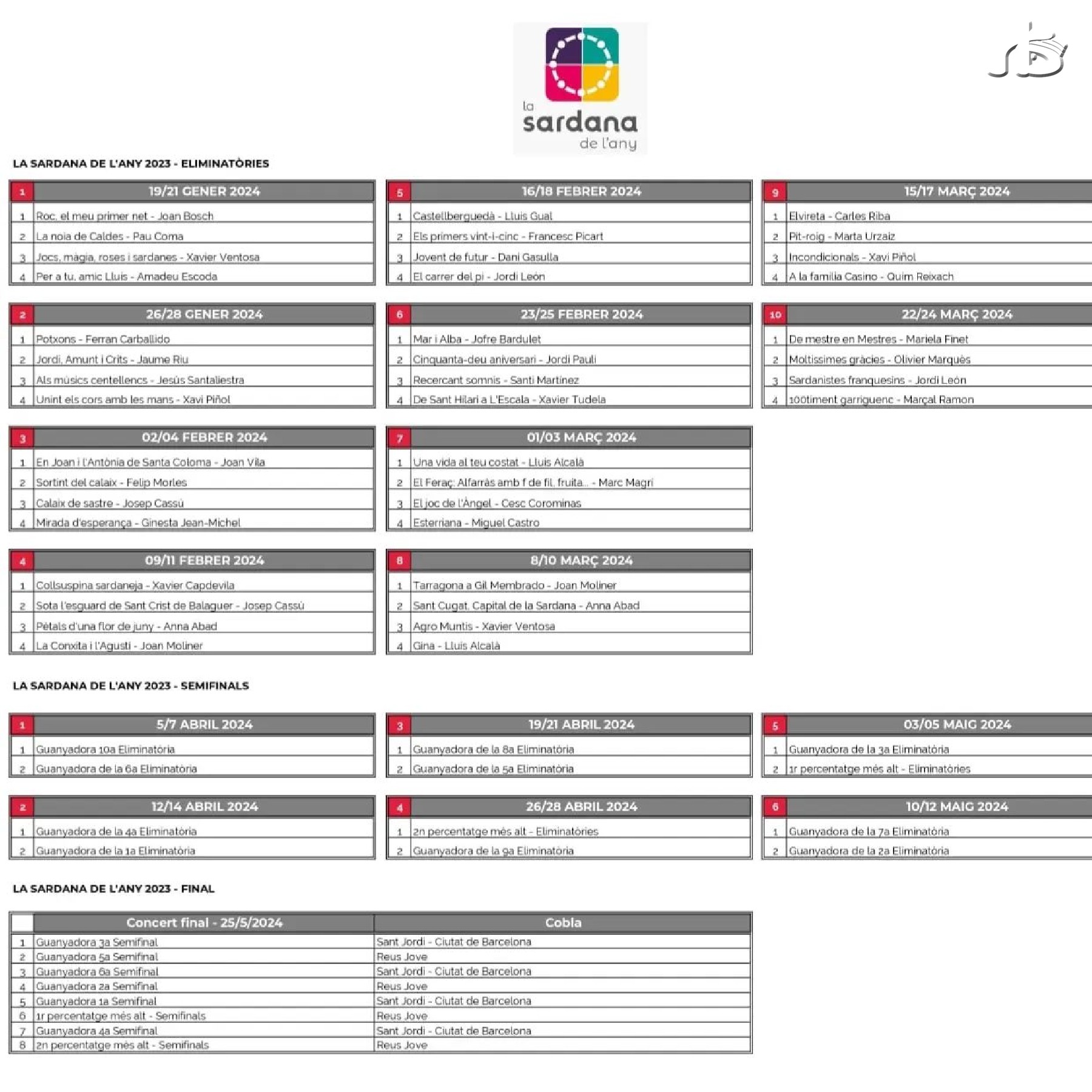 La primera obra que participarà al certamen és la sardana Sota l'Esguard del Sant Crist de Balaguer, una obra de Josep Cassú que es va estrenar a Balaguer el diumenge 26 de febrer del 2023 dins del concert de cloenda de la capitalitat, un concert que va anar a càrrec de la cobla Mil·lenària de Perpinyà.