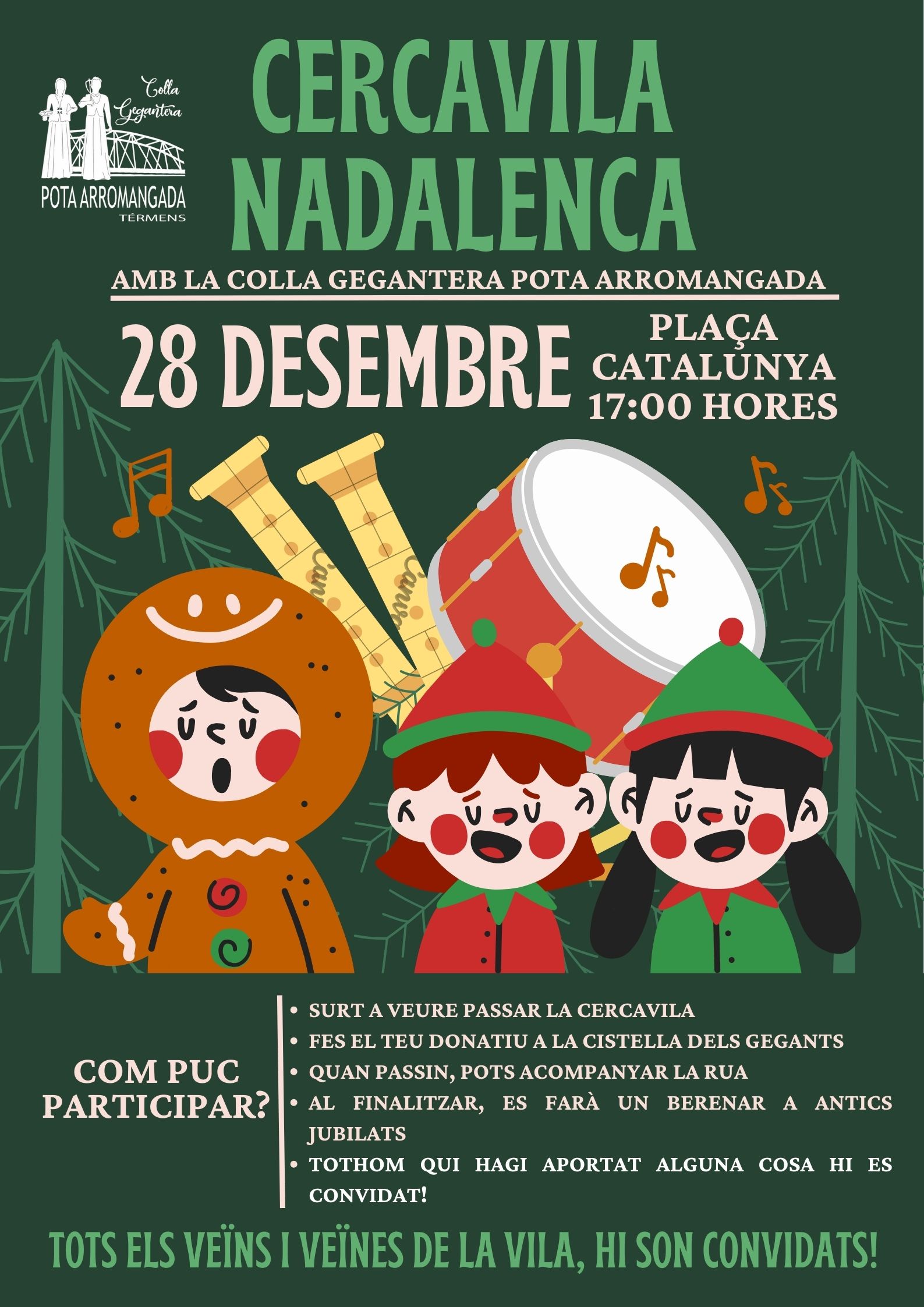 El 28 de desembre serà un dels dies més intensos: al matí, al Centre Cultural Sant Joan, tindrà lloc l’arribada dels Patges Reials a les 11 h i el Caga Tió a les 12 h, seguit del lliurament de premis del concurs de dibuix. A la tarda, la Colla Gegantera Pota Arromangada organitzarà la Cercavila Nadalenca, que sortirà a les 17 h de la Plaça Catalunya.