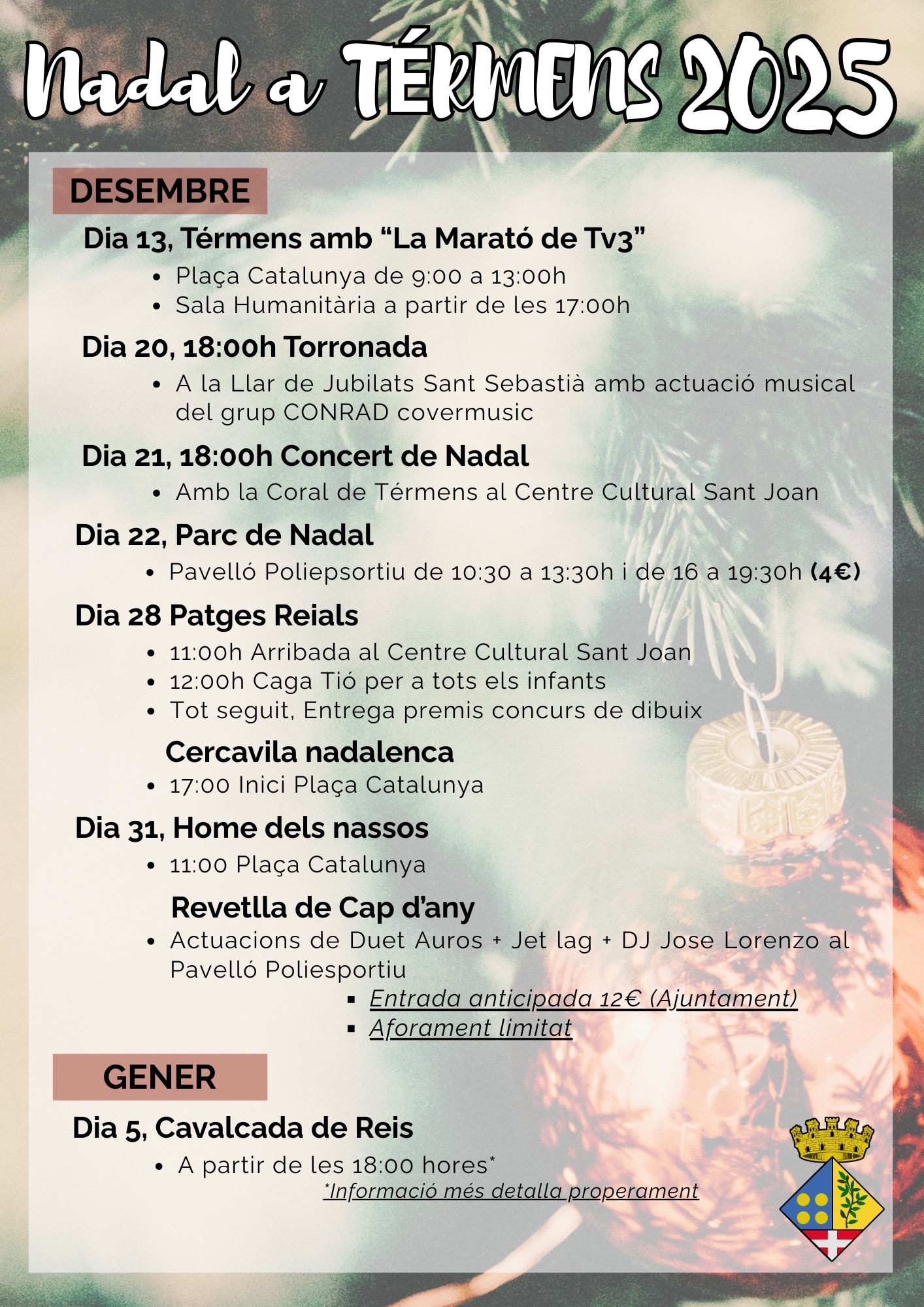 Les activitats seguiran el 31 de desembre. A les 11 h, a la Plaça Catalunya, arribarà l’Home dels Nassos. Ja al vespre, Térmens celebrarà la Revetlla de Cap d’Any al Pavelló Poliesportiu: l’obertura de portes serà a les 21.30 h, la connexió amb TV3 per seguir les campanades a les 23.30 h i, a partir de la mitjanit, actuacions de Duet Auros, Jet Lag i DJ Jose Lorenzo. L’entrada anticipada té un preu de 12 € i inclou cotilló (aforament limitat).