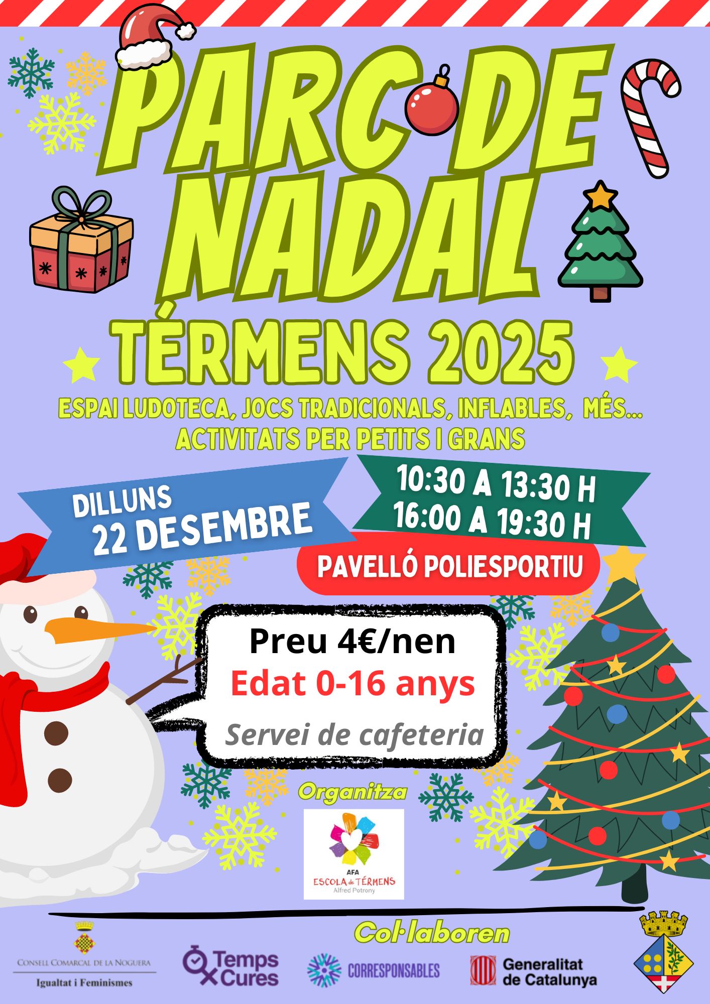 El 21 de desembre, el Centre Cultural Sant Joan acollirà el tradicional Concert de Nadal amb la Coral de Térmens a les 18 h. L’endemà, 22 de desembre, arribarà el Parc de Nadal al Pavelló Poliesportiu, amb espai ludoteca, jocs, inflables i activitats per a infants i joves de 0 a 16 anys, en horari de 10.30 a 13.30 h i de 16 a 19.30 h (4 €).