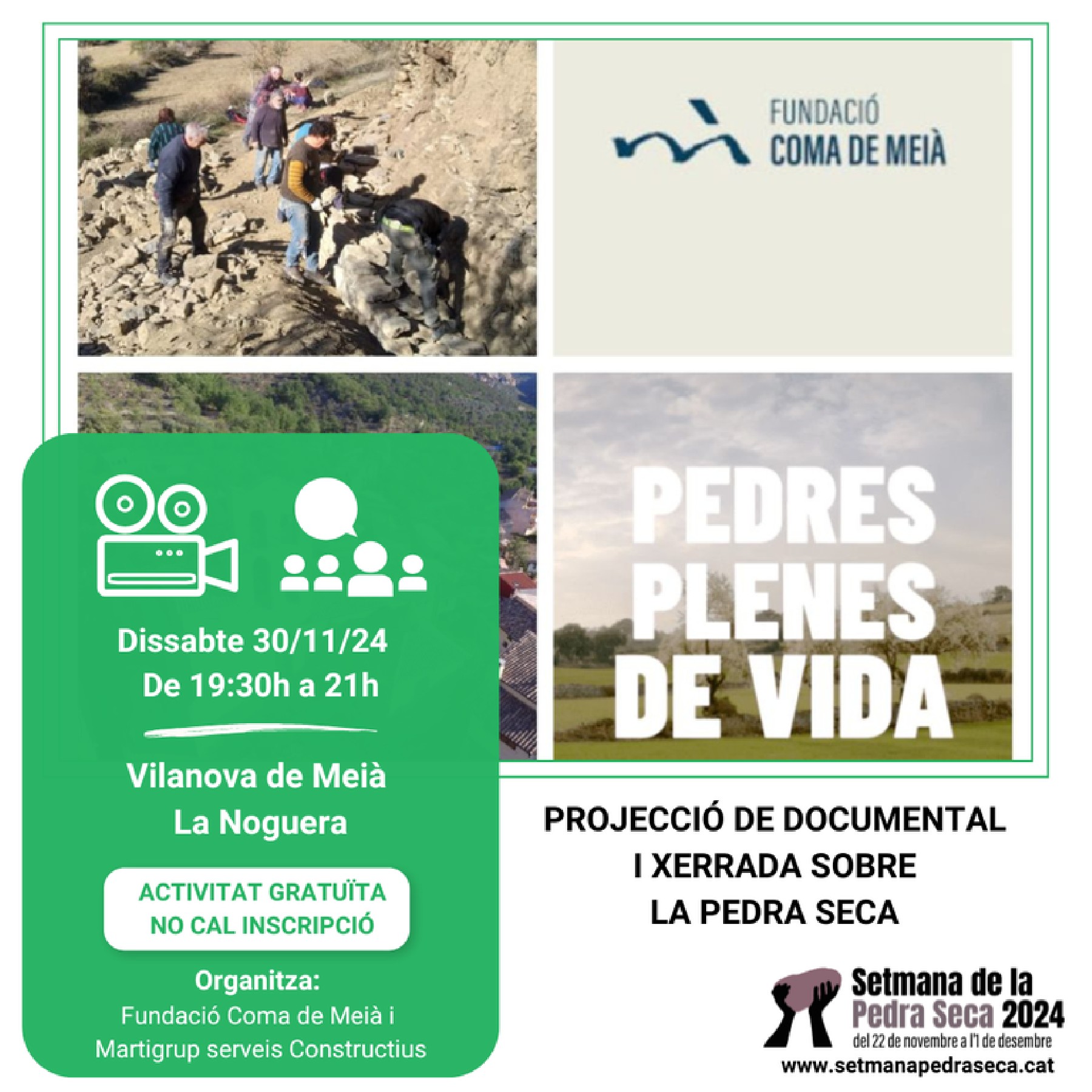 El mateix dissabte 30 de novembre, a les 19:30, la Sala del Casal de Vilanova de Meià serà també l'escenari d'una tarda dedicada a la pedra seca i el territori, amb la projecció del documental Pedres plenes de vida, la Guiomar i la Sargantana, que ofereix una mirada íntima i emotiva sobre aquest patrimoni. La jornada es clourà amb una xerrada del mestre marger Josep Maria Martí, que aprofundirà i posarà en valor el patrimoni de pedra seca al territori.